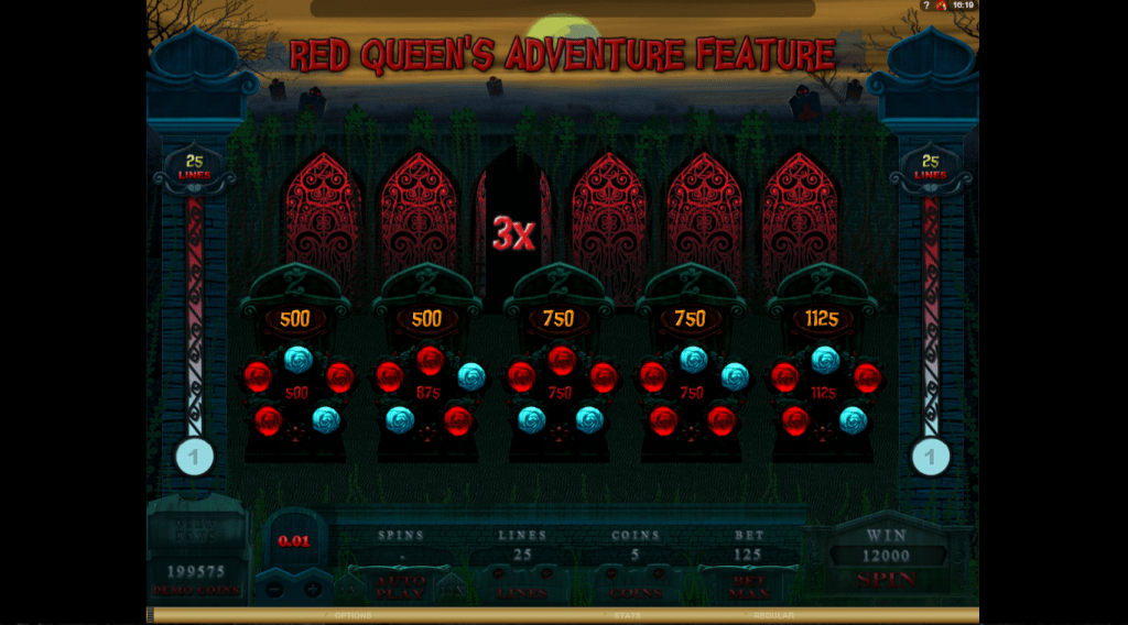 Keys or Scatter 2, which appears on reels two, three and four, opens the way to the Red Queen’s courtyard by launching the Red Queens Adventure Feature function. Within this function, you will be presented with five tombstones with one white rose each. Your task is to choose three of the five roses, which will be painted red and disclose their rewards. Collect as many points as possible and you will be taken to the next level of this game!